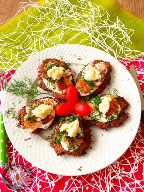 Placki cukiniowo – marchewkowo – ziemniaczane z wędzonym łososiem i musem jogurtowo – miodowym