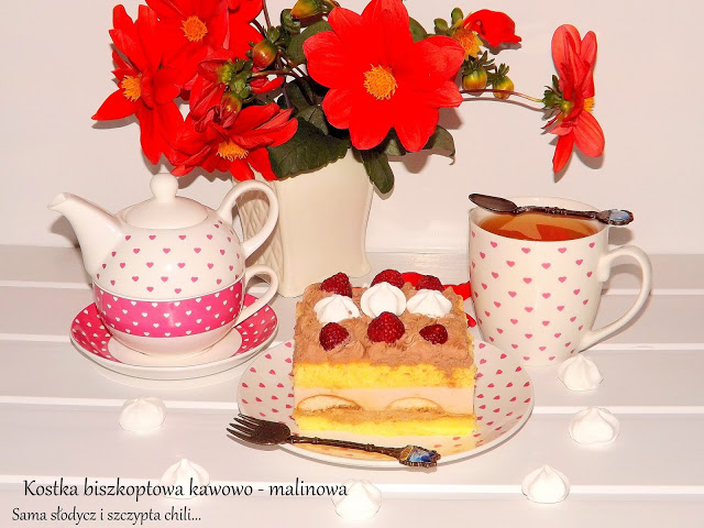 Przy niedzieli zapraszam na pyszne i proste ciasto z kremem kawowym, malinowo – śmietankowym biszkoptami i bezami MAMUT.