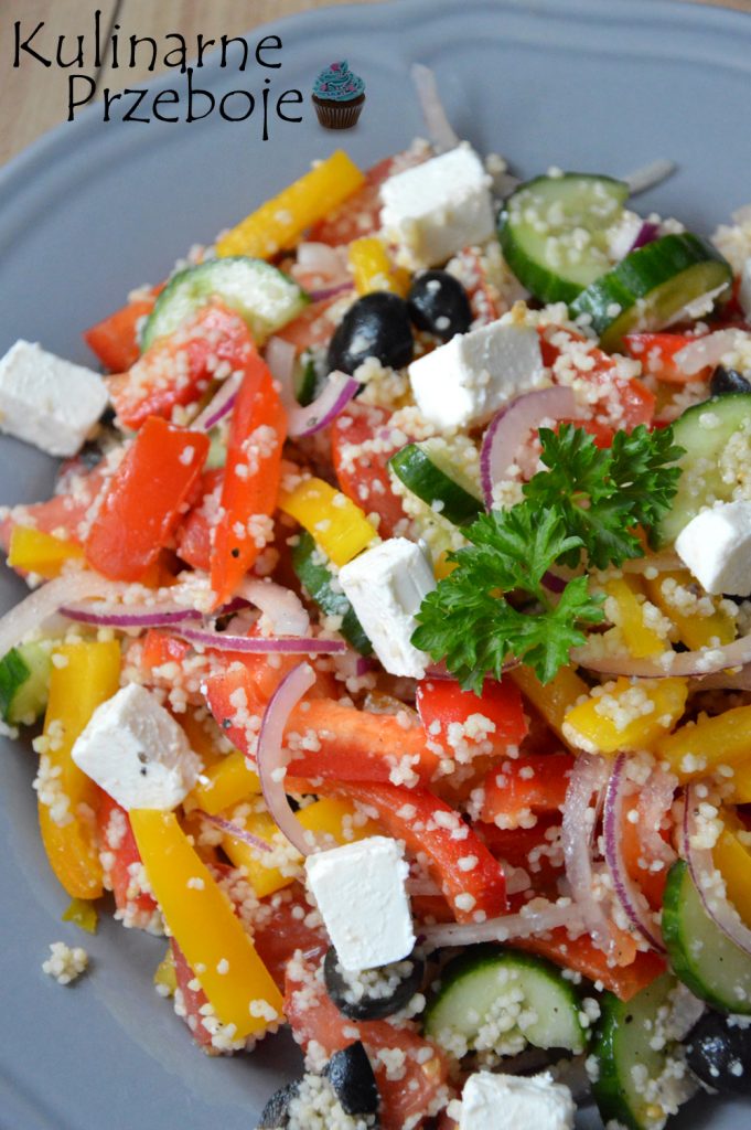 Sałatka z kaszą kuskus i serem feta, czyli krócej mówiąc sałatka z kuskusem i fetą. Szybka, prosta i bardzo smaczna 🙂 Swoim składem nieco przypomina popularną sałatkę grecką. Więcej przepisów na sałatki znajdziecie tutaj: Sałatki i surówki – przepisy.