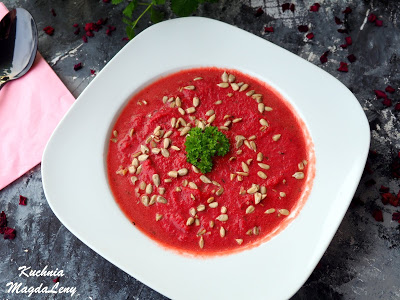 Zupa typu krem z pieczonych buraków z dodatkiem czosnku i tymianku, zabielona…
