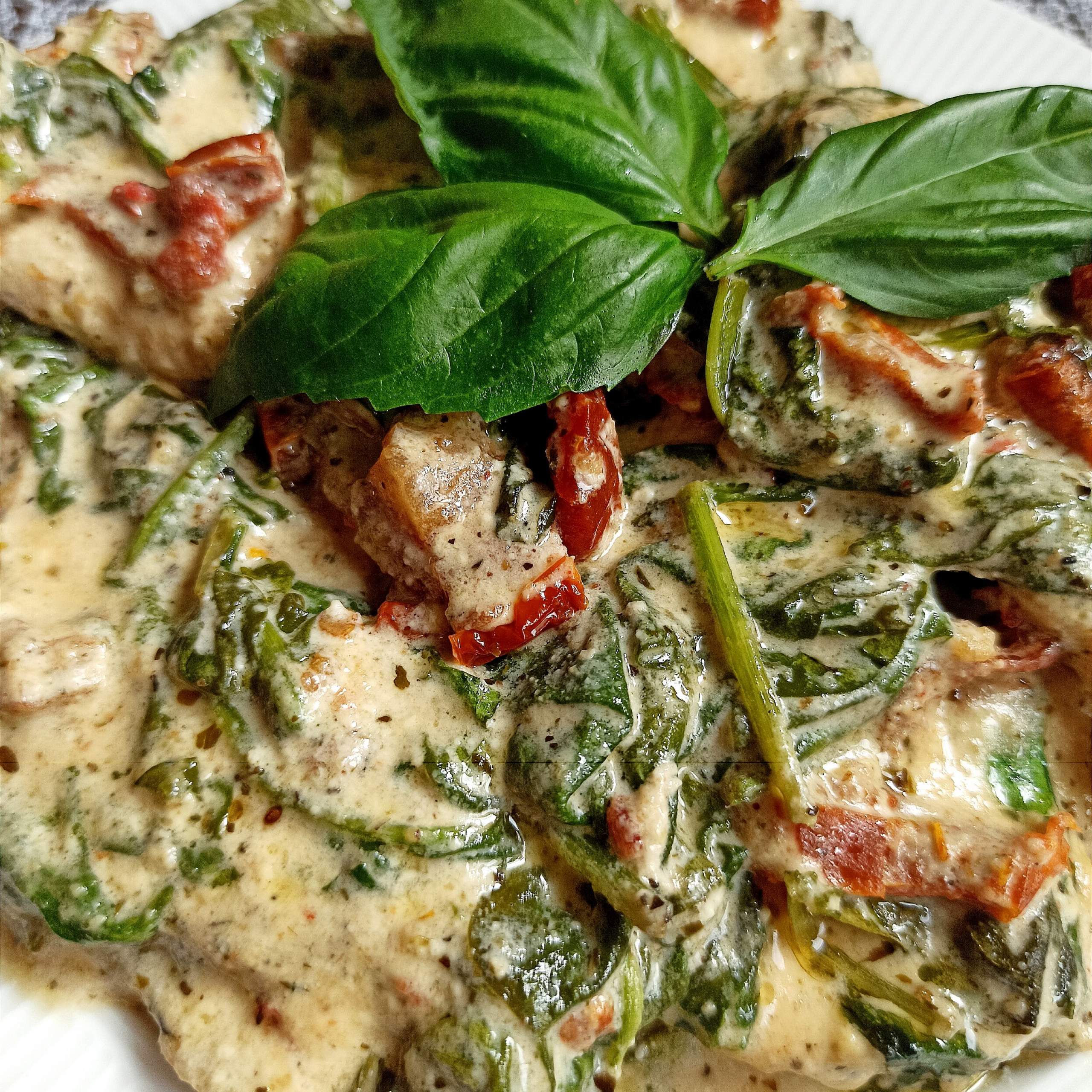 Piersi z kurczaka pieczone w kremowym sosie z dodatkiem suszonych pomidorów, szpinaku…