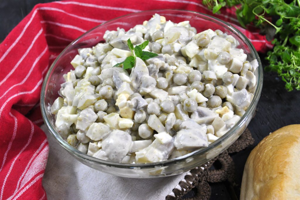 Błyskawiczna sałatka pieczarkowa z groszkiem i ogórkami. Pyszna i szybka w wykonaniu. Sprawdzi się idealnie na niejednej imprezie.