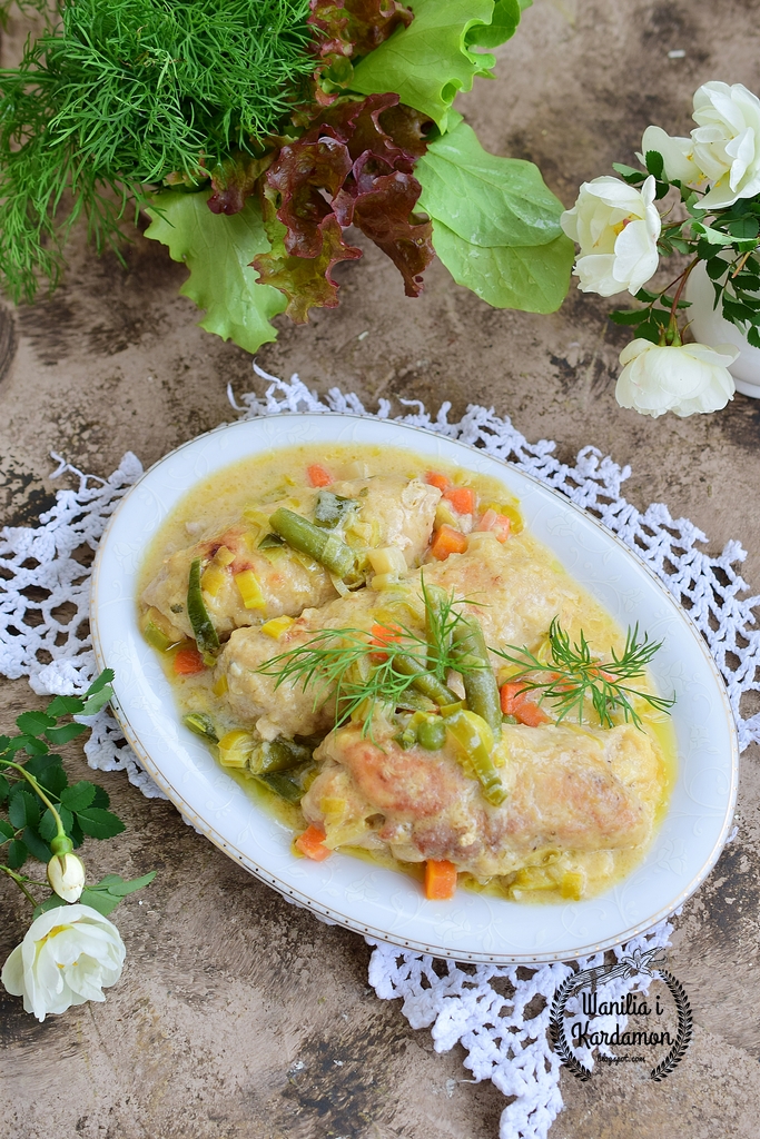 Nadziewane roladki schabowe duszone w kremowym sosie z warzywami