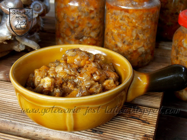 Grzyby mielimy na grubych oczkach. Cebulę również mielimy na grubych oczkach lecz osobno, marchewkę ścieramy na tarce o grubych oczkach. Marchewkę i cebulę dusimy z olejem
