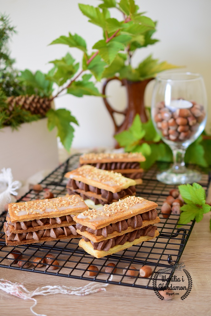 Millefeuille to deser składajacy się z upieczonego ciasta francuskiego, znaczy „tysiąc płatków” w oryginale przekładamy kremem waniliowym, ja zrobiłam swoją wersję i przełożyłam go kremem czekoladowym wyciskanym przez szprycę cukierniczą, choć jest czasochłonny efekt smakowy jest tego wart. Cudownie wygląda i tak samo smakuje.