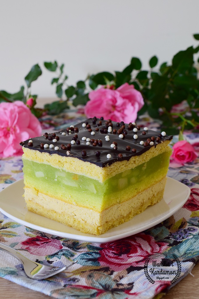 Duża porcja dobrego ciasta. Kruche blaty, gotowany sernik, warstwa biszkoptowa i prażone jabłka z galaretką-ciasto choć czasochłonne nie jest trudne do wykonania, jedno z moich ulubionych połączeń smakowych. Najlepsze na drugi dzień po przygotowaniu, kiedy kruche blaty zmiękną i smaki się połączą.