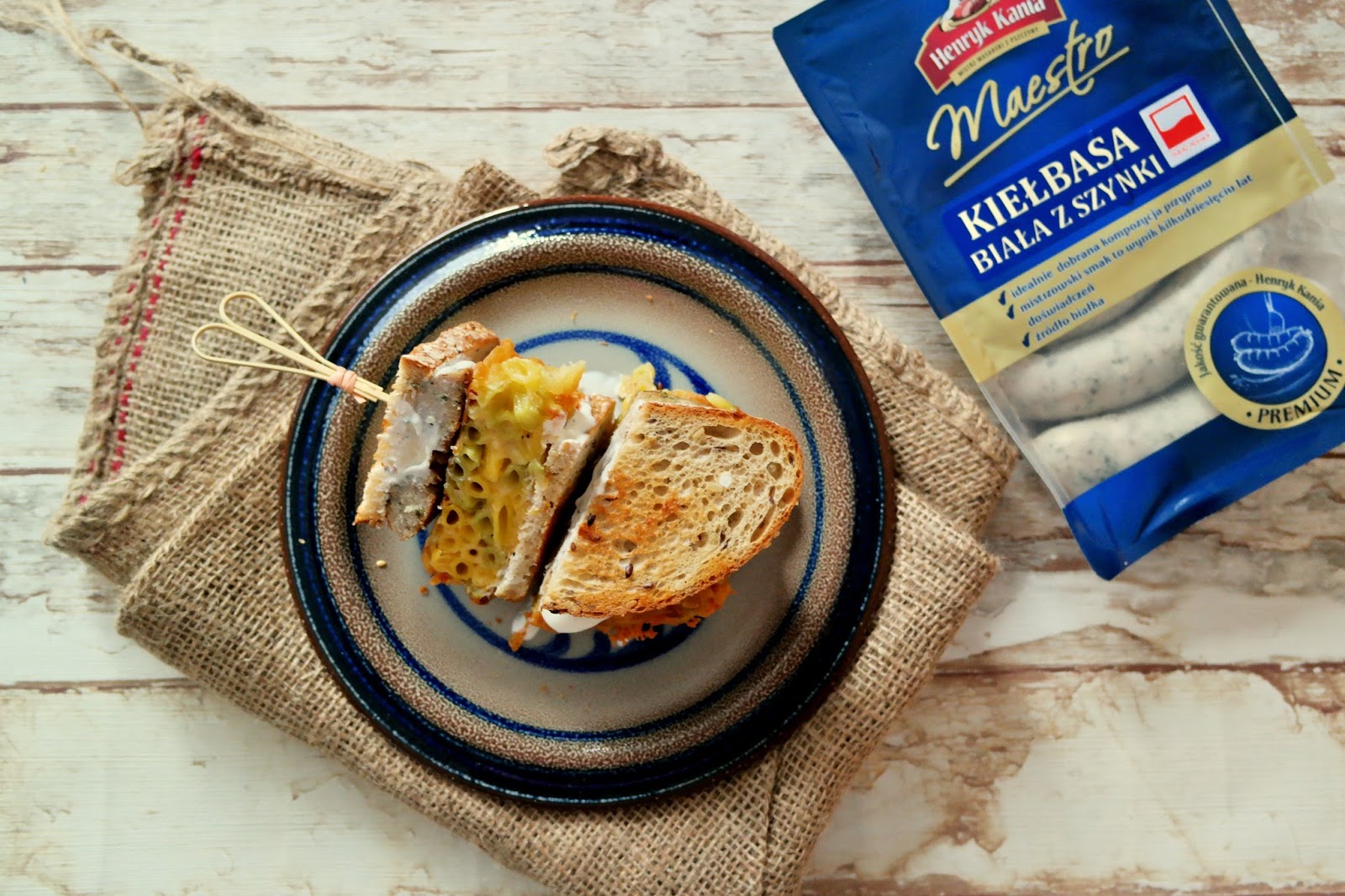 Potrzebujemy:1 opakowanie kiełbasy białej z szynki Maestro Henryk Kaniakilka kromek chleba wieloziarnistegoMakaronowy burger:200 g suchego makaronu typu kolanka, ja użyłam kolorowych mini kolanek 350 g żółtego serasól, pieprzTempura:100