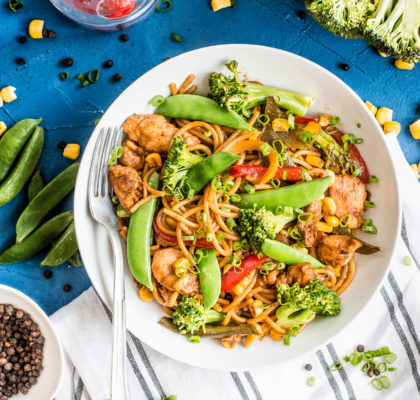 Makaron z kurczakiem, groszkiem cukrowym i warzywami w sosie Teriyaki