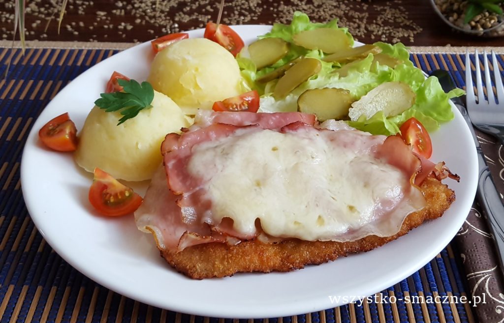 Kotlet schabowy przykryty podsmażoną szynką, a także startym serem mozzarella smakuje wybornie, więc gorąco polecam takie połączenie
