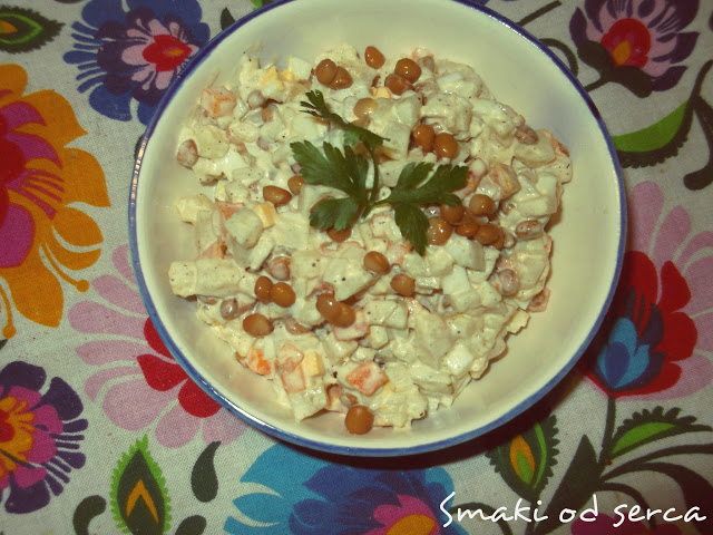 Sałatka jarzynowa to królowa niejednej imprezy!Ja lubię czasem ją przełamać nietypowym składnikiem.Dzisiaj takim składnikiem jest soczewica konserwowa.Nadaje delikatnie inny smak sałatce,