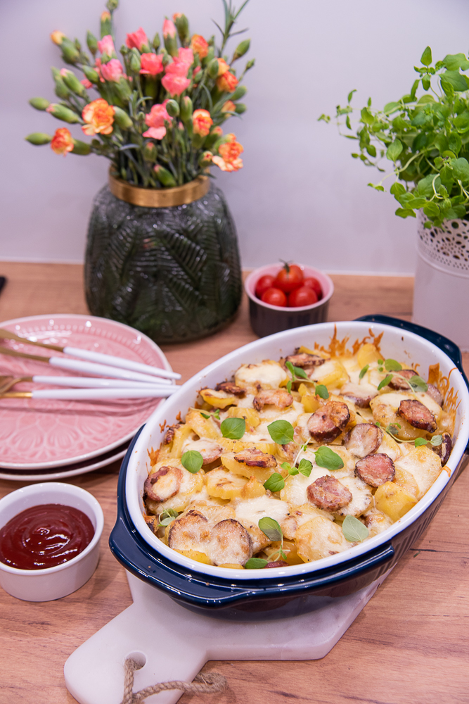 Zapiekanka ziemniaczana z kiełbasą i żółtym serem to pomysł na pyszny obiad…