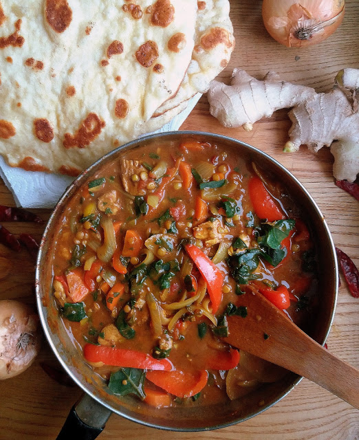 Dziś znów kuchnia indyjska, tym razem w postaci aromatycznego curry. Za każdym razem przygotowuję tę potrawę inaczej, w zależności od sezonu i zawartości lodówki. Ostatnio dorzuciłam do niej indyka, brązową soczewicę, pomidory i paprykę.Curry jest pyszne z ryżem basmati i domowym chlebkien naan. Smacznego:)