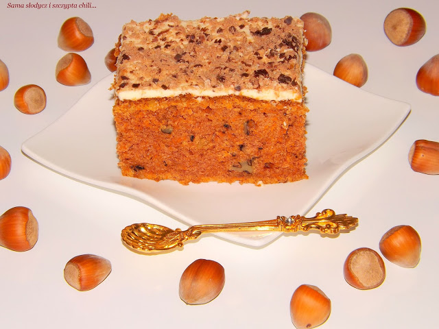 Marchewkowe ciasto z orzechami i polewą serkową.