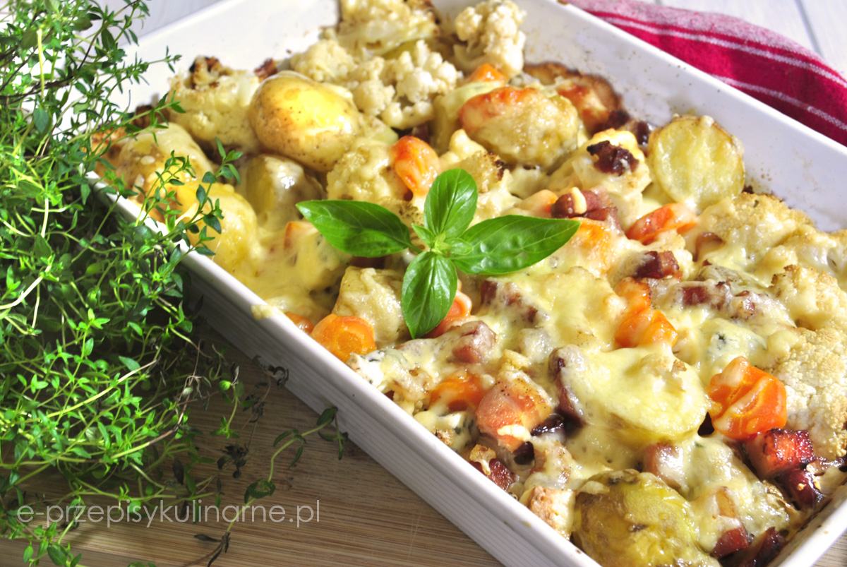 Zapiekanka z ziemniakami i kalafiorem w sosie śmietanowym z dodatkiem sera pleśniowego…