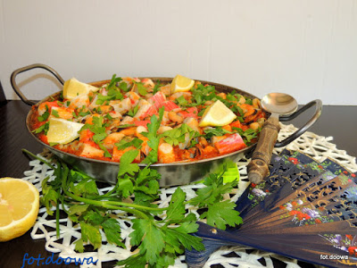 Paella z pomidorami i mieszanką morską