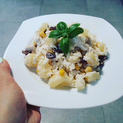 Składniki:1 saszetka ugotowanego ryżu1 podwójna pierś z kurczaka50 g rodzynek½ puszku ananasa1…