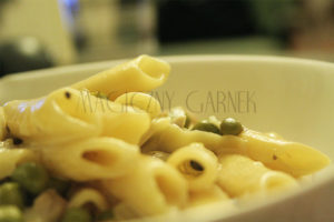 Makaron z kurczakiem, pieczarkami i zielonym groszkiem to szybki wczorajszy obiad. Do tradycyjnego zestawu makaronu, kurczaka i pieczarek dodałam zielony groszek, by ożywić kolorystykę dania. Udało się, wszystkim smakowało połączenie makaronu i zielonego groszku – a to wszystko przygotowałam w jednym garnku. Szybkie, jednogarnkowe danie obiadowe z mięsem, warzywami i