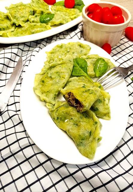 Pierogi szpinakowe z pieczarkami i kurczakiem