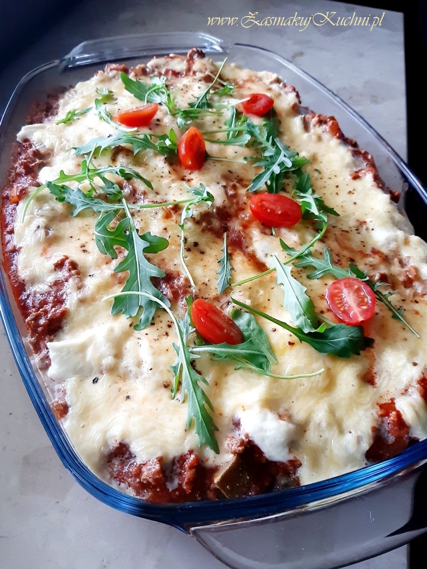 Zapiekanka makaronowa z mięsem mielonym, sosem meksykańskim, pomidorami, aromatyczną papryką i sosem…