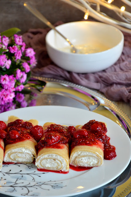 Muszę przyznać, że lubię nie tylko jeść, ale też przygotowywać naleśniki. Często eksperymentuję zmieniając składniki. Zamiast mleka wykorzystuję często maślankę, ale tym razem zastąpiłam ją po części jogurtem naturalnym i śmietaną, co również dało ciekawy efekt. Gotowe naleśniki podałam z nadzieniem tradycyjnym, bo twarogiem, ale za to z dodatkowym