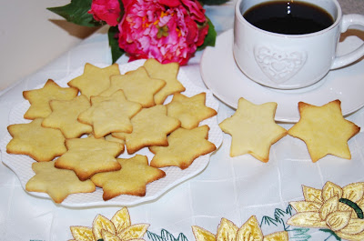 Kruche ciasteczka idealne do kawy lub herbaty. Można je polać czekoladą, polukrować lub ładnie udekorować. Z podanej porcji wyszły mi trzy duże blaszki ciastek. Kształty można wycinać dowolne. U mnie tym razem gwiazdki. Przechowywać można w szklanym słoju lub metalowej puszce.