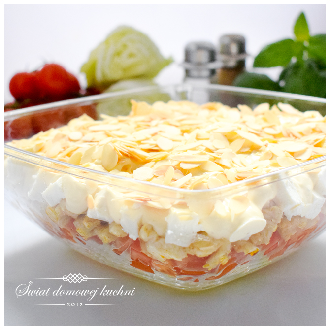 1/2 małej kapusty pekińskiej,3 średnie pomidory,500 g piersi z kurczaka,przyprawa do złocistego kurczaka,200 g sera feta Fawita z Mlekowity,10 dag płatków migdałowych.Sos czosnkowy: