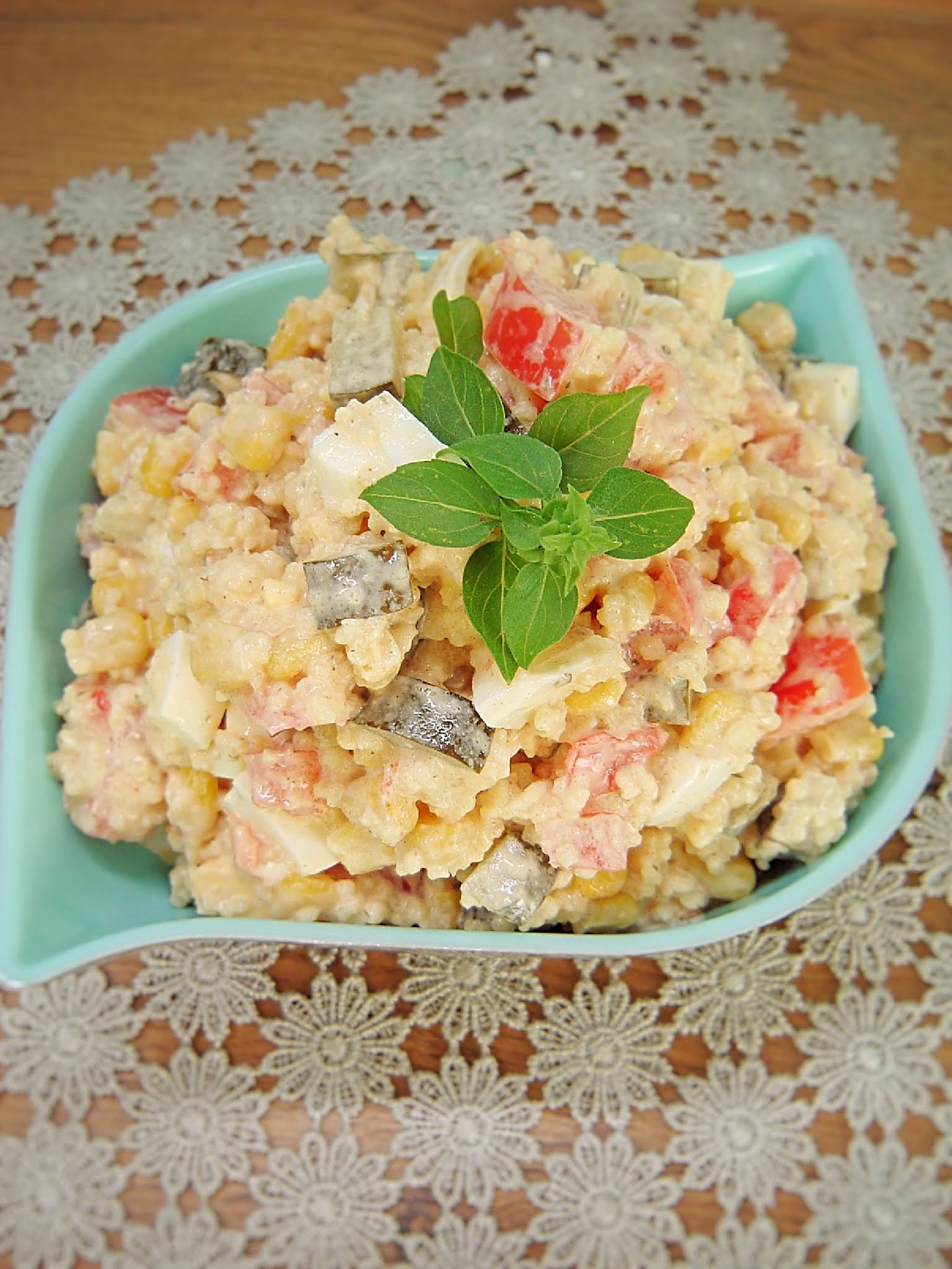 Szybka, treściwa sałatka z kaszą kuskus, jajkiem, ogórkiem kiszonym, pomidorami i kukurydzą…