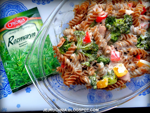 Składniki:200 g makaronu pełnoziarnistego (u mnie świderki),po 1/2 małej papryki żółtej