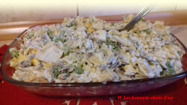 szklanka makaronu ryżowego1 mały brokuł1/2 puszki kukurydzy1/2 szklanki ziaren słonecznika10 dag. sera żółtego