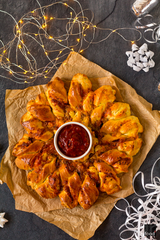 Imprezowy wieniec drożdżowy z paluchami do odrywania pełnymi ciągnącego się sera cheddar, które można zanurzyć w ulubionym dipie… Czy to nie brzmi jak idealna przekąska na imprezę? Ja myślę, że to must bake przy organizowaniu domówki dla miłośników sera. 😉 Jeżeli polubiliście przepis na serowe paluchy z ciasta francuskiego,