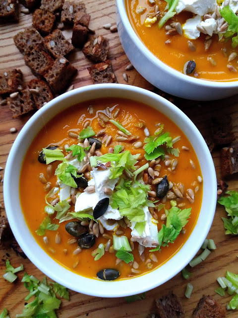Dziś proponuję kremową zupę z marchewki – jej słodycz bardzo dobrze komponuje się ze słonym smakiem fety, rozgrzewającą kurkumą i sokiem z cytrusów. Najlepsza będzie z chrupiącymi grzankami lub pestkami. Aby jeszcze dodać jej smaku, możemy wlać do niej trochę śmietanki lub mleka kokosowego. Smacznego:)