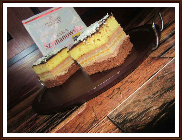 2. Białka ubić na sztywno z cukrem, dodać żółtka, mąkę zmieszaną z proszkiem do pieczenia. Całość wymieszać.