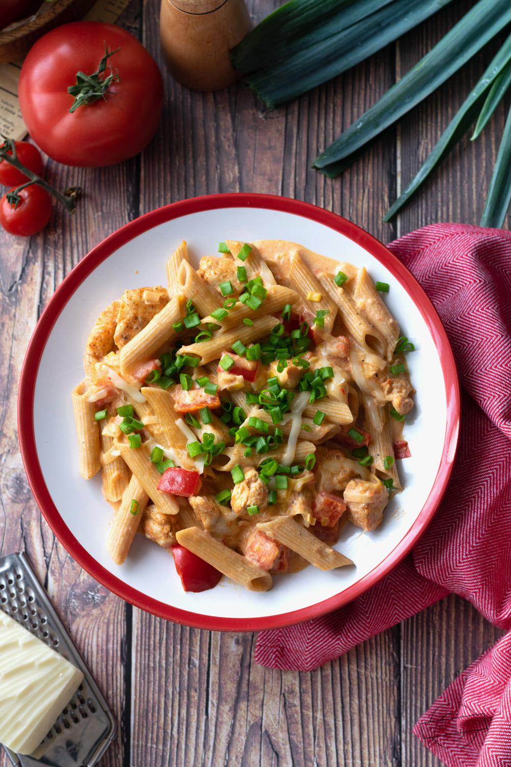 Makaron z kurczakiem w śmietanowym sosie z dodatkiem pora, papryki i pomidora…