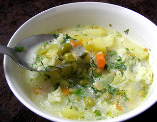 Składniki: woda 3 litry, kalafior 1 większy, włoszczyzna 1 pęczek, groszek konserwowy…