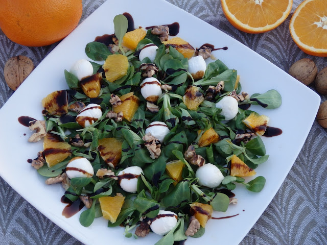 Po świątecznym obżarstwie przyda się coś lekkiego w postaci sałatki. Roszponka w towarzystwie mozzarelli, pomarańczy i prażonych orzechów świetnie się komponują. Całość skropiłam słodkim syropem klonowym i kwaskową glazurą balsamiczną.