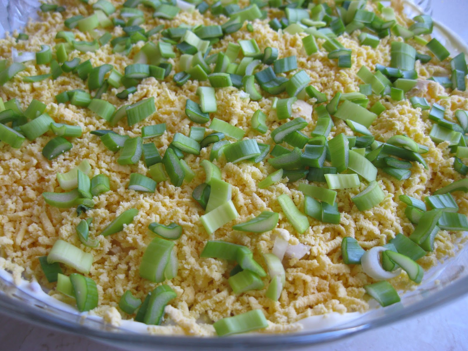 Żółtka ścieramy na drobnych oczkach tarki, natomiast białka i ser żółty na grubszych. Cebulę siekamy na drobną kostkę. Na dno naczynia wykładamy ser i tuńczyka, smarujemy majonezem, posypujemy cebulką i żółtkami na które