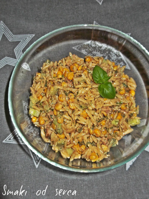 1 podwójna pierś z kurczakapuszka kukurydzy1 duży zielony ogórek2 szklanki ugotowanego makaronu orzopęczek koperkuząbek czosnku
