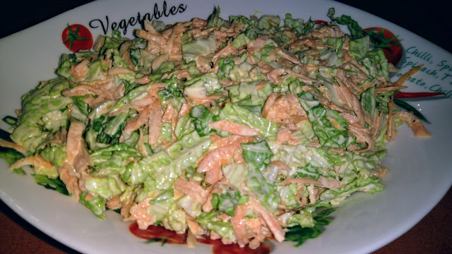 1/2 główki kapusty pekińskiej2 marchewki 2 łyżki majonezu2 łyżki jogurtu naturalnego 1 – 2 ząbki czosnkusól,pieprzsok z cytryny Kapustę pekińską poszatkować ( tylko część zieloną) i skropić sokiem z cytryny. W tym czasie obrać marchewkę i zetrzeć ją na tarce o