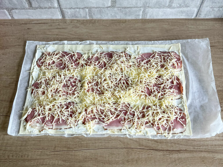 Drobne kąski z ciasta francuskiego nadziewanego kremowym serkiem śmietankowym, szynką i serem…