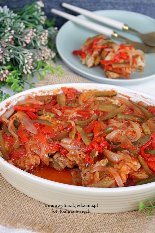 składniki:500 g filetów rybnych200 g papryki konserwowej200 g ogórków konserwowych250 g cebulitłuszcz…