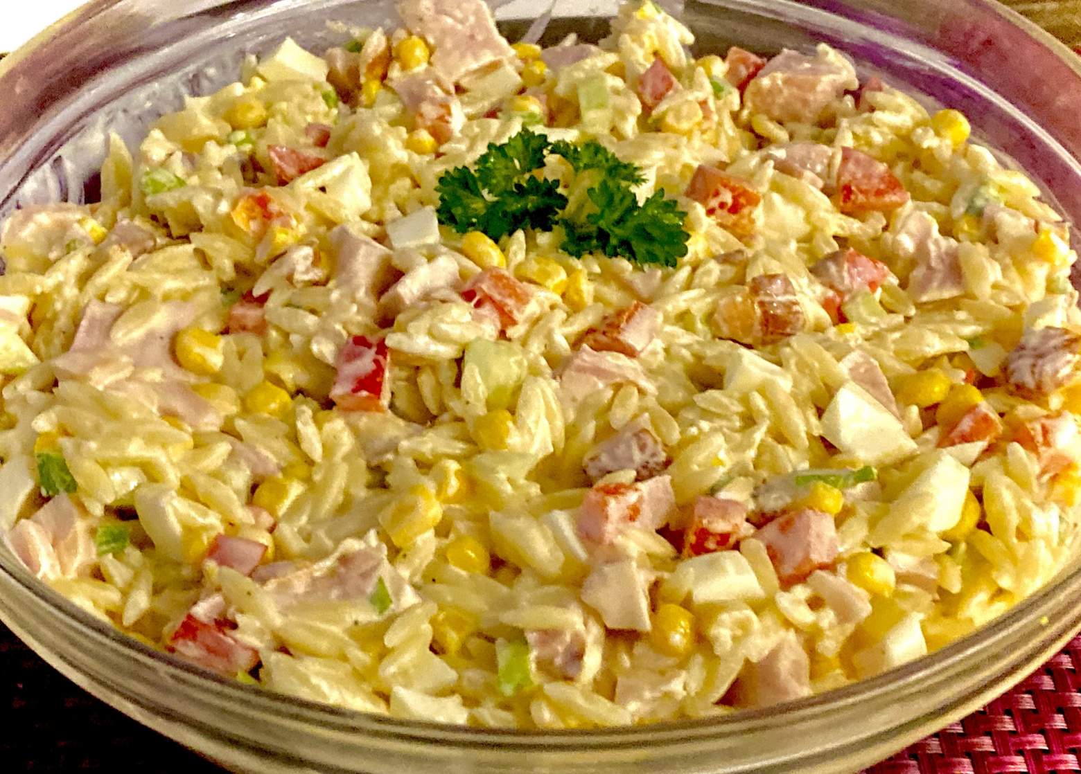 Kolorowa sałatka z makaronem i wędzonym kurczakiem
