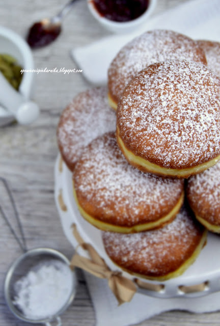 Ze smażeniem pączków miałam poczekać do Tłustego Czwartku…ale to jeszcze tyle czasu, a ja już teraz miałam ochotę zjeść choć jednego puchatego pączusia…No i zjadłam dwa ( a wieczorem 40 minutowe „spotkanie” z Chodakowską, żeby spalić choć ułamek tych pochłoniętych kalorii 😉 ). Tym razem wykonałam ciasto na samych