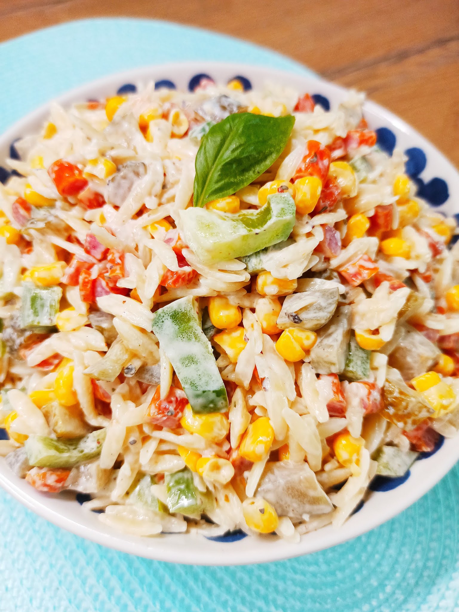 Pyszna i sycąca sałatka z makaronem w kształcie ryżu, kabanosami, papryką, ogórkiem…