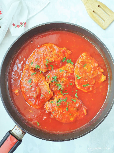 Schab w sosie pomidorowym Dziś polecam prosty, duszony schab w sosie pomidorowym.…
