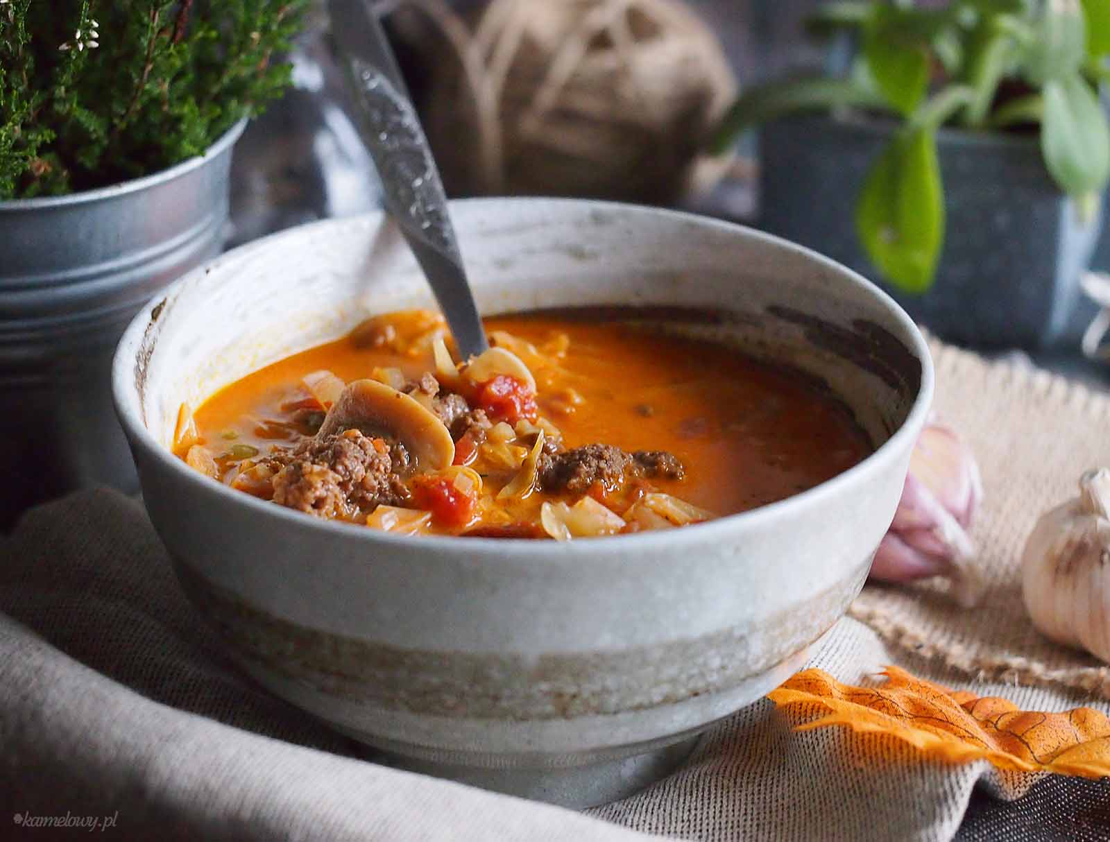 Dziś proponuję bardzo sycący i pyszny kapuśniak z mięsem i grzybami, który na pewno zaspokoi głód całej rodziny. Dzięki dodatkowi pomidorów, groszku i chilli nabiera charakteru, a i rozgrzeje w te chłodne dni. Jak to zupy mają w zwyczaju – jest bardzo łatwa w przygotowaniu. Polecam gorąco!