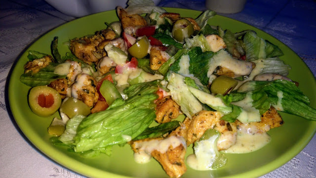 ok 40 dag piersi z kurczaka1/2 sałaty lodowej2-3 łodygi selera naciowego1/2 papryki czerwonejzielone oliwki ( u