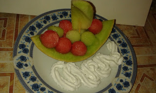 MelonArbuzSok z cytrynyBita śmietana Łyżką powycinać kulki z arbuza i melona. Ze…
