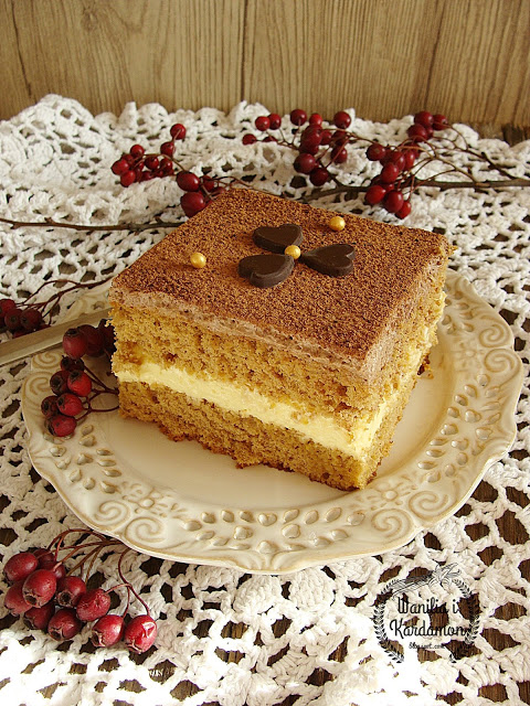 Wilgotne biszkoptowe blaty o smaku krówki, słodki miodowo- jajeczny krem, zwieńczenie całego…