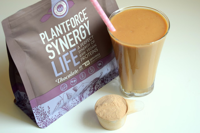 150 ml wody kokosowej 150 ml wody 1 miarka (20 g) białka wegańskiego Plantforce o smaku czekoladowym (Siła Roślin) 1 średni banan1/2 małego mango mrożonego 1 łyżeczki proszku maca