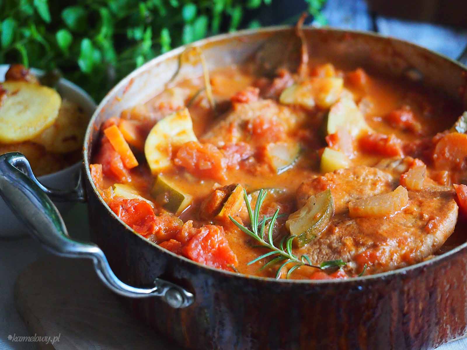 Dziś proponuję danie obiadowe, z rodzaju tych, które robią się praktycznie same. Schabowe pieczone w pysznym sosie na bazie pomidorów z cukinią z pewnością sprawdzą się na leniwy obiad dla całej rodziny. Ten przepis pochodzi z książki jednego z moich ulubionych autorów Gino D’Acampo “Saturday Kitchen”, która jest
